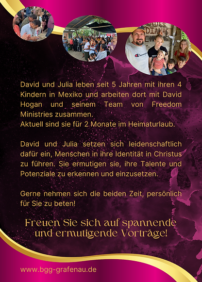 Am 08. und 09.11.2025 dienen David und Julia Türtscher in unserer Gemeinde. Auch dazu laden wir ganz herzlich ein.